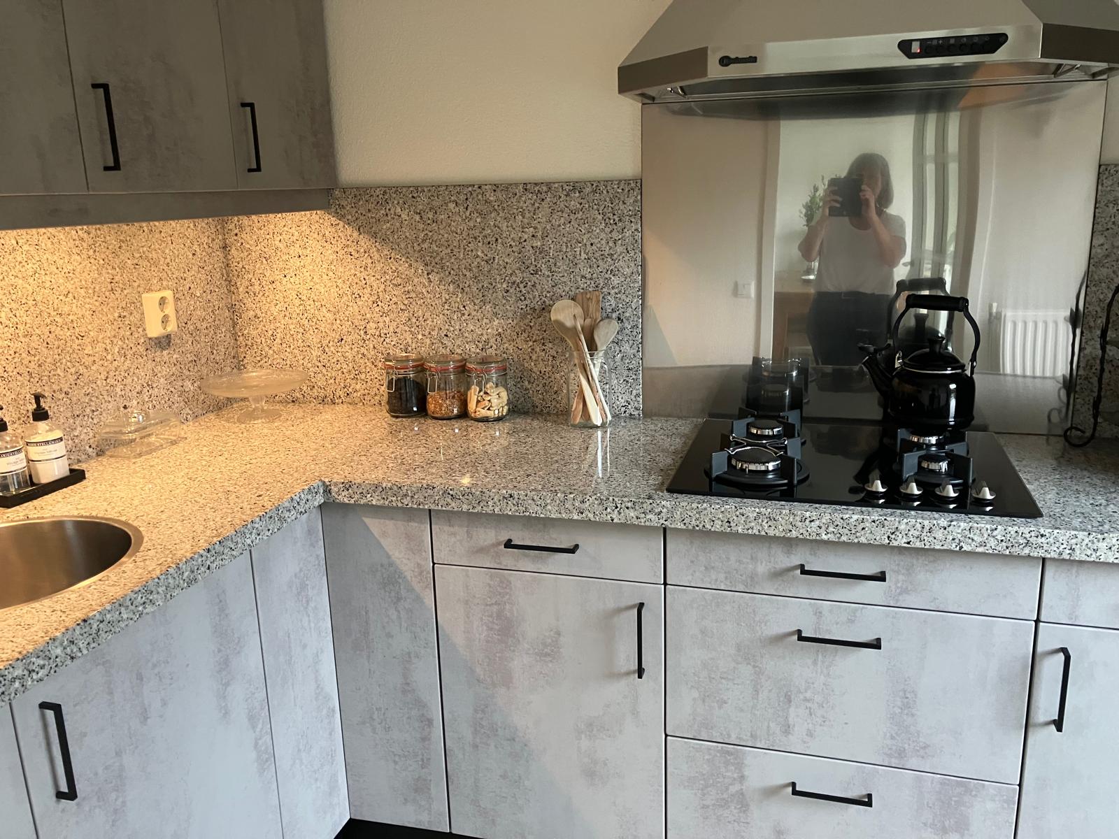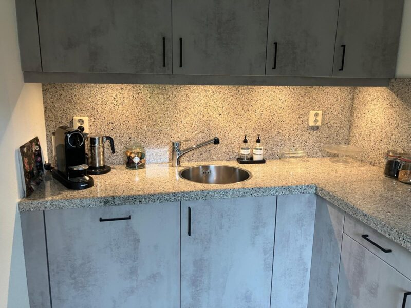 Deze keuken in Drunen is door ons genoveerd van een hout naar een gemarmerd beton uitstraling. Een ware metamorfose tot grote tevredenheid van de bewoners. En dat allemaal in 1 dag. Alsof er een nieuwe keuken is geplaatst.